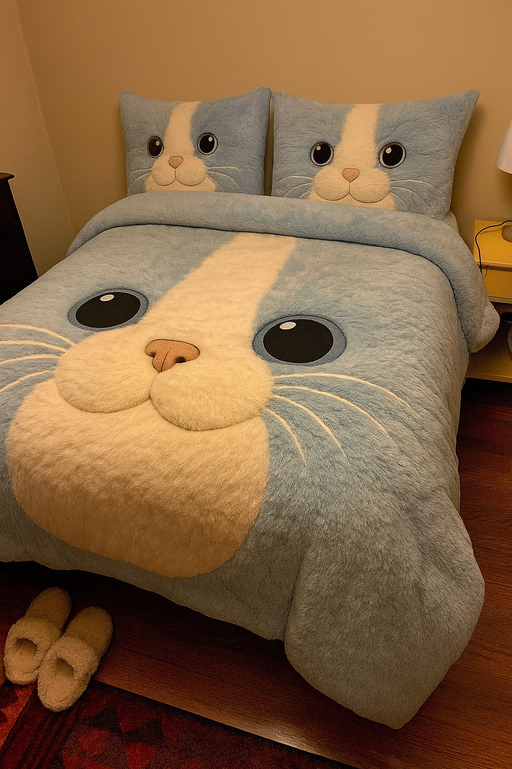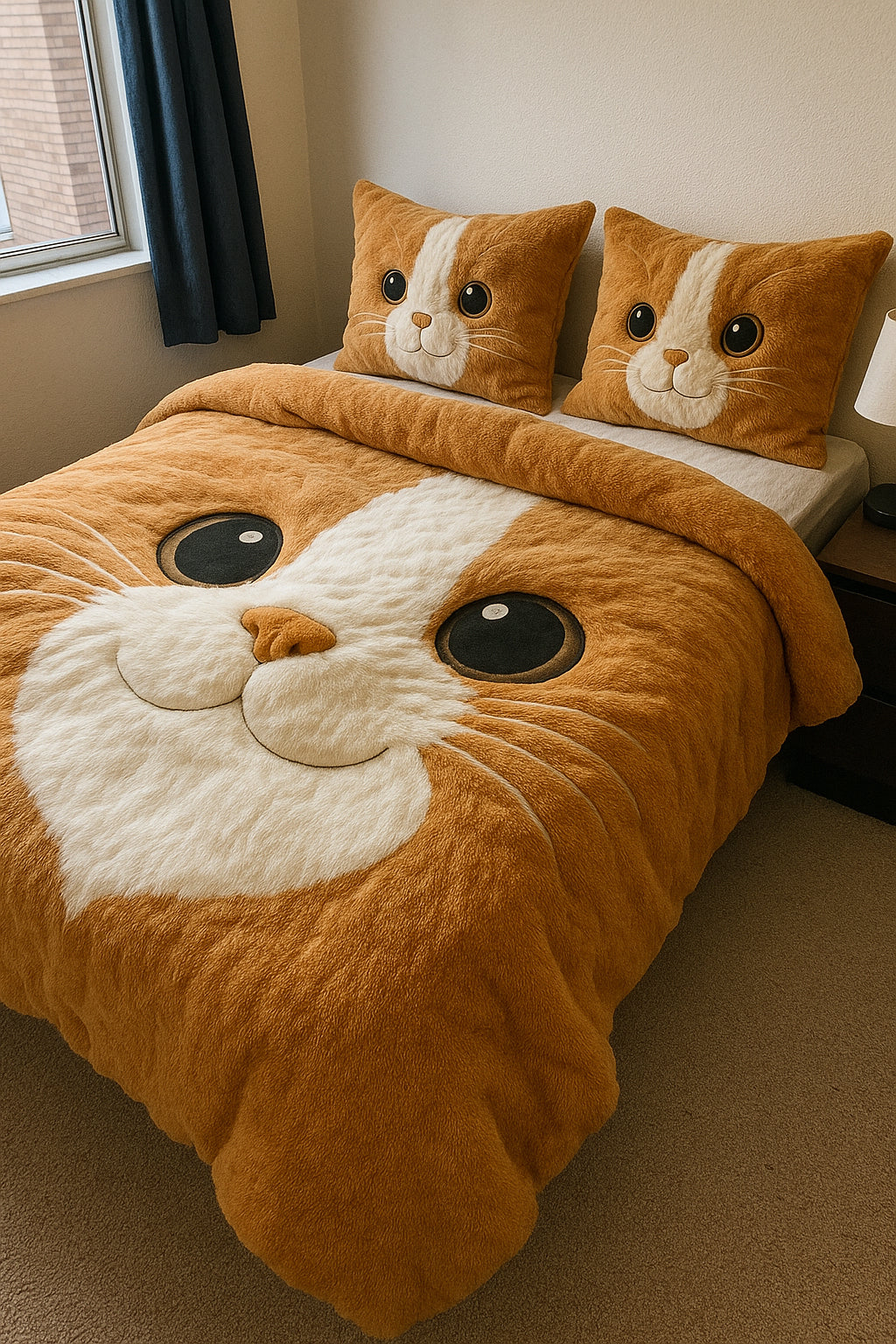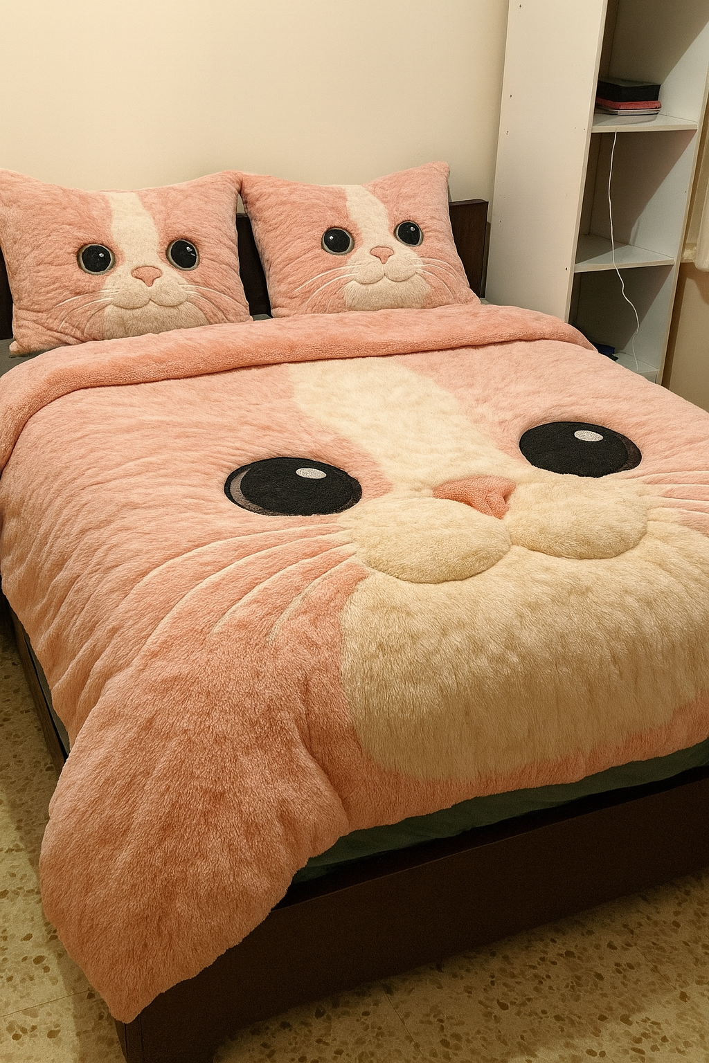 Con la sua enorme testa di gatto super tenera stampata sul copripiumino e le due federe coordinate, questo completo trasforma immediatamente la tua camera in uno spazio pieno di gioia e buon umore.